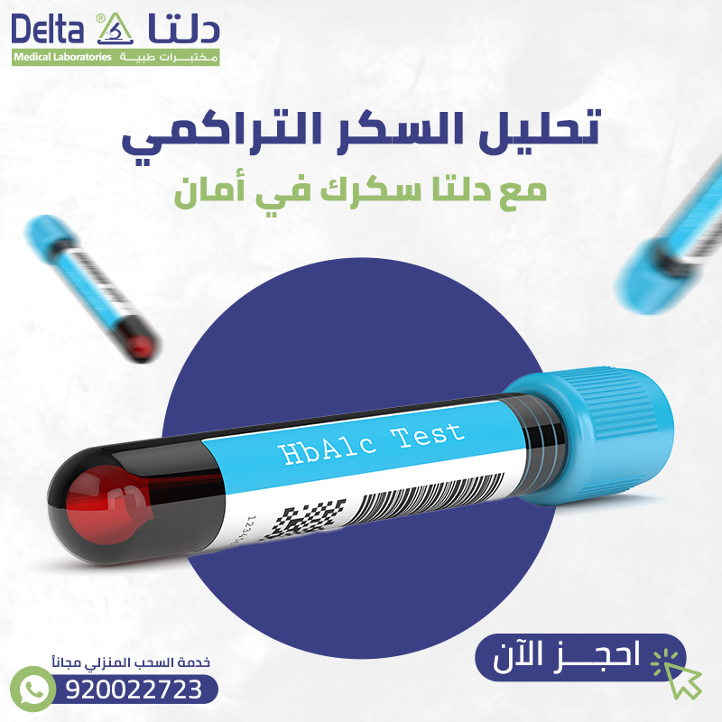 هل أنت مريض سكر، وتخاف أن تأتيك مضاعفاته بشكل مفاجيء؟، أو هل لديك تاريخ عائلي بمرض السكري، وتخشى الإصابة به؟، لا تقلق، ولا تفكر كثيرًا، فمختبرات دلتا دائمًا معك، وتأتيك بالحل الأمثل، وهو تحليل السكر التراكمي الأداة الأقوى في تشخيص ومتابعة مرض السكري، فاحجز الآن، وكن في أمان.